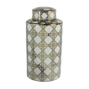 Amazingly Decorative Ceramic Covered Jar, White And Gold
