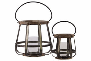 Wood Round Lantern with Handle - Set of 2 - Brown - Benzara