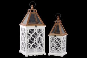 Wood Square Lantern with Pierced Metal Top Set of 2 - White - Benzara