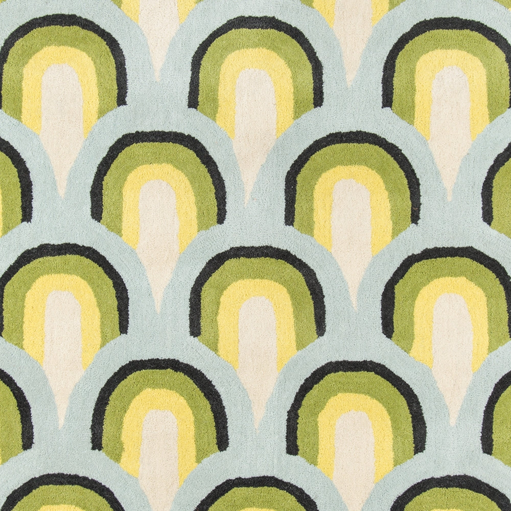 The graphic design of this modern area rug adds contemporary flair to floors throughout the home. Captured in a spectrum of vivid shades, polka dots, chevron stripes, triangulated patterns and checkerboard prints are perfect for layering above carpet or hard surfaces. Hand tufted from natural wool fibers, this decorative area rug assortment emanates fun with its oversized geometric arrangements and vibrant splashes of color.
